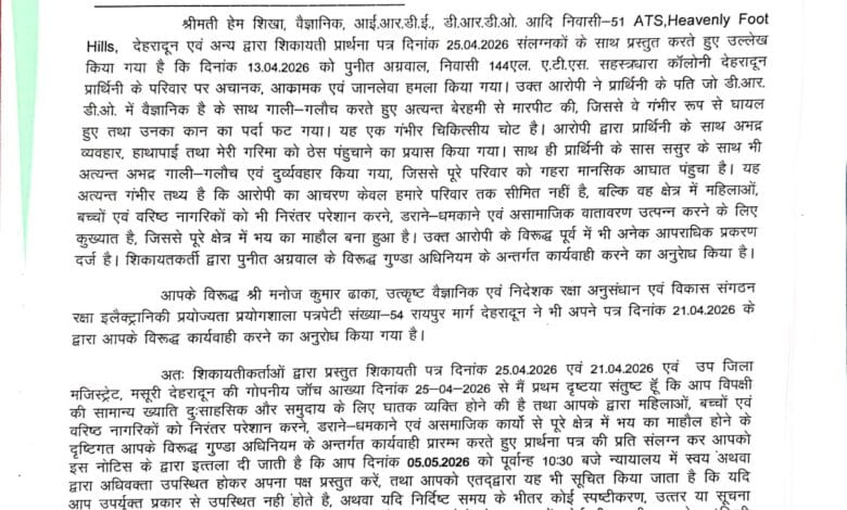 देहरादून। शहर के सहस्त्रधारा रोड स्थित एटीएस कालोनी में बिल्डर की गूंडागर्दी पर जिला मजिस्टेªट कोर्ट ने संज्ञान लेते हुए गुंडा एक्ट में नोटिस जारी करते हुए 07 दिन के भीतर प्रतिउत्तर प्रस्तुत करने के निर्देश दिए हैं प्रतिउत्तर प्राप्त न होने के की दशा में जिला बदर की कार्यवाही शुरू कर दी जाएगी। इससे पूर्व भी विवादित बिल्डर पर दीपावली में नाबालिग बच्चों पर पिस्टल लहराने तथा लाईसेंसी शस्त्र को प्रदर्शित करने पर डीएम ने शस्त्र लाईसेंसधारक पुनीत अग्रवाल की लापरवाही मानते हुए उनका शस्त्र जब्त करते हुए शस्त्र लाईसेंस निलम्बित कर दिया था। आरोपी बिल्डर पर डीआरडीओं वैज्ञानिक के साथ मारपीट एवं उत्पीड़न, नशे में धुत होकर एटीएस आरडब्ल्यूए अध्यक्ष के साथ मारपीट, बच्चों से गाली गलौच, दीपावली पर पिस्टल तानने, बच्चों से गाली गलौच एवं गाड़ी से टक्कर मारने का प्रयास, जनरल बाडी मीटिंग में धमकाने अभद्र भाषा का प्रयोग, आरोपी द्वारा निवासियों एवं आरडब्ल्यूए के सदस्यों को जानबूझकर झूठे मुकदमों एवं निराधार आरोपों में फंसाकर उत्पीड़न करने का प्रयास, विधवा महिला की भूमि को कूट रचित रजिस्ट्री एवं अनाधिकृत कब्जा मामलों विभिन्न धाराओं में 05 एफआईआर दर्ज हैं।