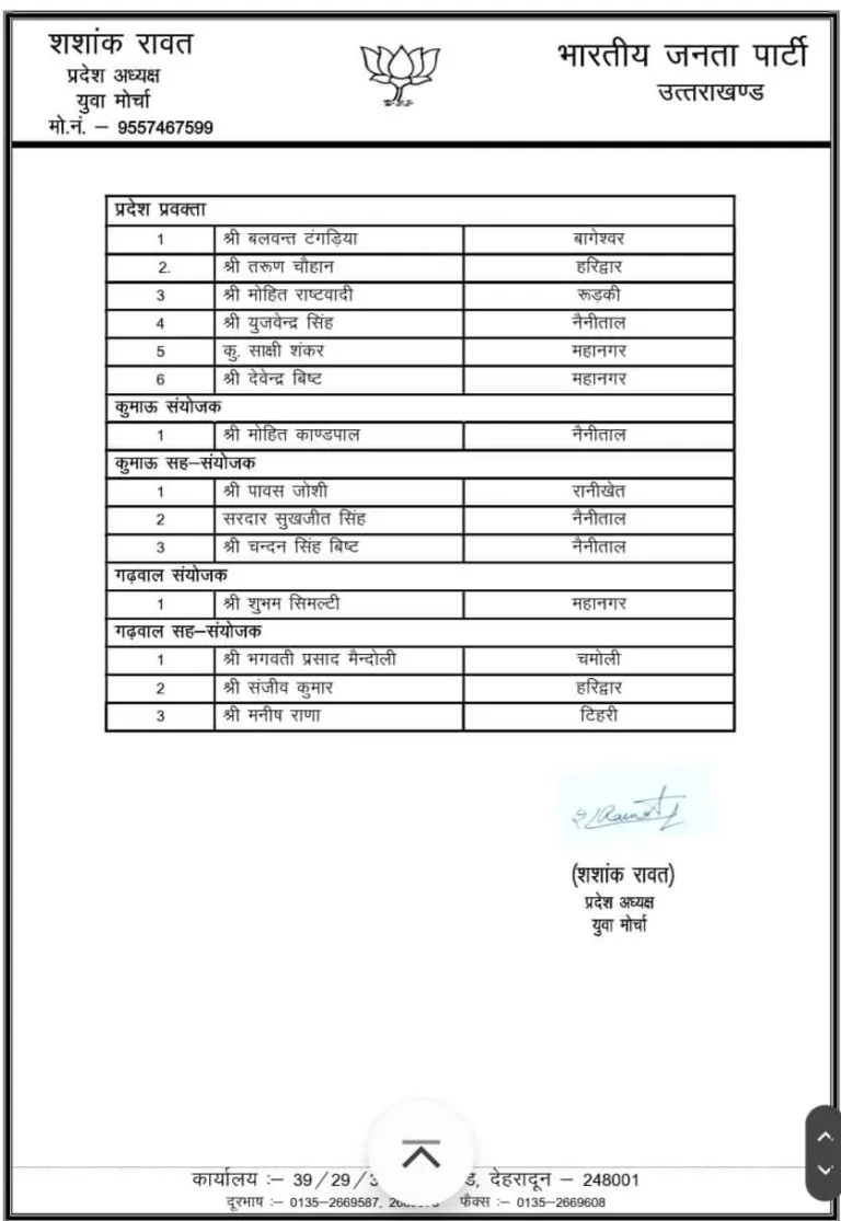 भारतीय जनता पार्टी के माननीय प्रदेश अध्यक्ष श्री महेन्द्र भट्ट जी की सहमति के पश्चात् भारतीय जनता पार्टी, युवा मोर्चा के प्रदेश पदाधिकारियों की निम्न प्रकार घोषणा की जाती है.