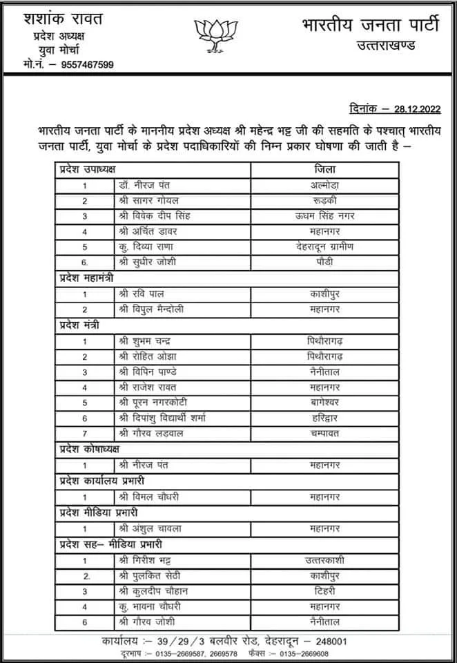 भारतीय जनता पार्टी के माननीय प्रदेश अध्यक्ष श्री महेन्द्र भट्ट जी की सहमति के पश्चात् भारतीय जनता पार्टी, युवा मोर्चा के प्रदेश पदाधिकारियों की निम्न प्रकार घोषणा की जाती है.