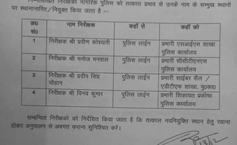 निरीक्षक विनय कुमार को पुलिस लाइन से प्रभारी शिकायत प्रकोष्ठ पुलिस कार्यालय भेजा गया