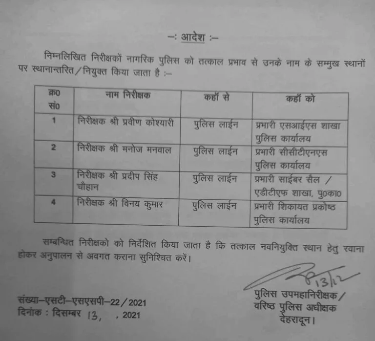 आज दिनाँक 13/12/21 पुलिस उपमहानिरीक्षक /वरिष्ठ पुलिस अधीक्षक देहरादून द्वारा निम्न निरीक्षको के स्थानांतरण उनके नाम के सम्मुख अंकित स्थानों पर किए गए।