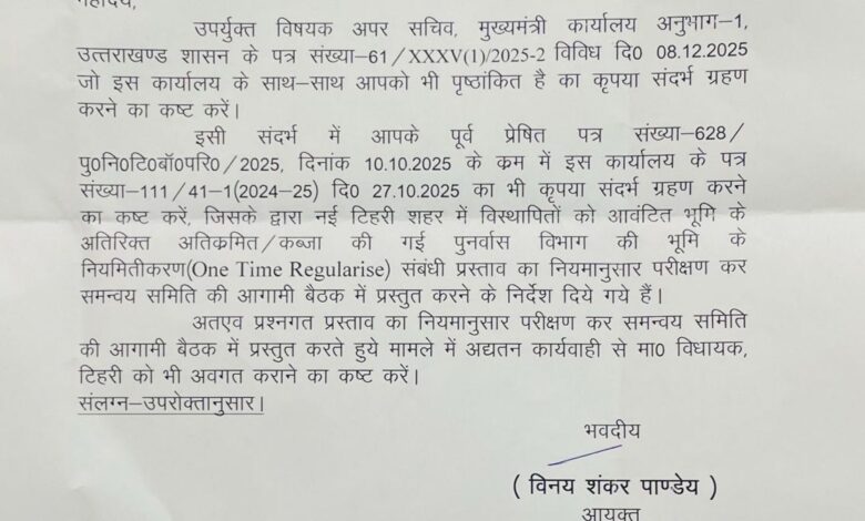 आयुक्त कार्यालय ने यह भी निर्देश दिए हैं कि नियमितीकरण से जुड़े प्रस्ताव की अद्यतन कार्यवाही से माननीय विधायक टिहरी, किशोर उपाध्याय को भी अवगत कराया जाए।
