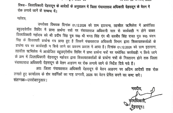 इसके बावजूद पंचायतराज स्तर पर समयबद्ध कार्यवाही न किए जाने की शिकायत जिलाधिकारी को प्राप्त हुई। शिकायतकर्ताओं के प्रार्थना पत्रों पर अपेक्षित कार्रवाई में लापरवाही पाए जाने पर जिलाधिकारी ने संज्ञान लेते हुए प्रकरण के निस्तारण तक जिला पंचायत राज अधिकारी, देहरादून के वेतन आहरण पर अग्रिम आदेशों तक रोक लगाने के निर्देश दिए थे, जिसके फलस्वरुप जिला पंचायत राज अधिकारी, देहरादून के वेतन आहरण पर रोक लगा दी गई है।