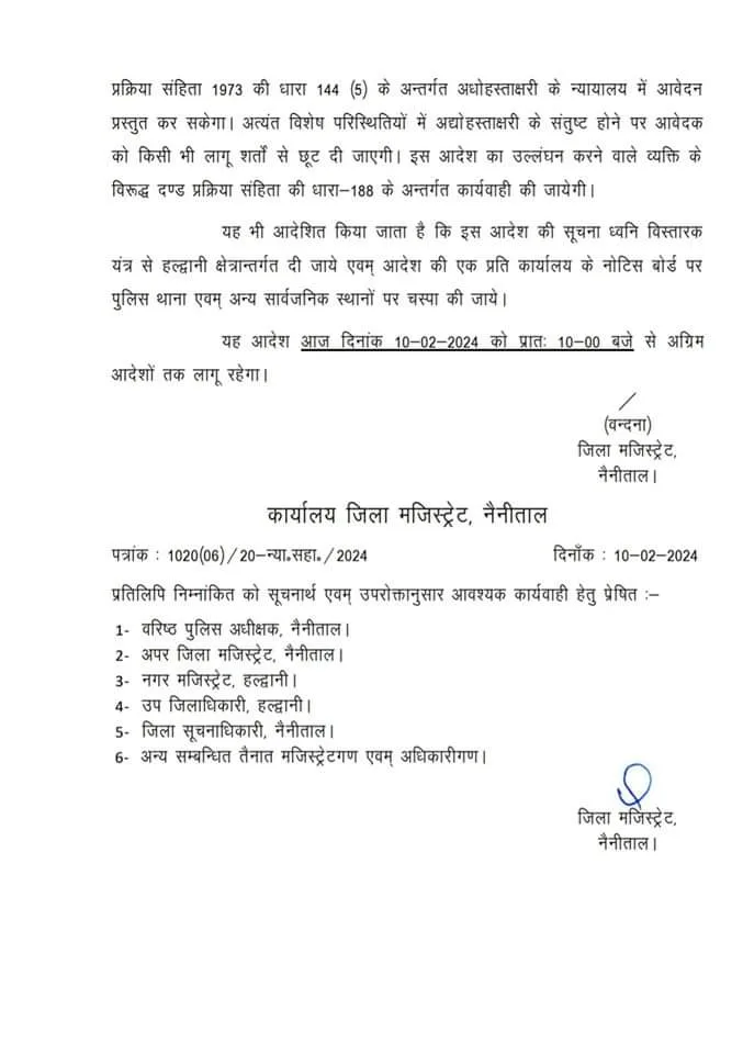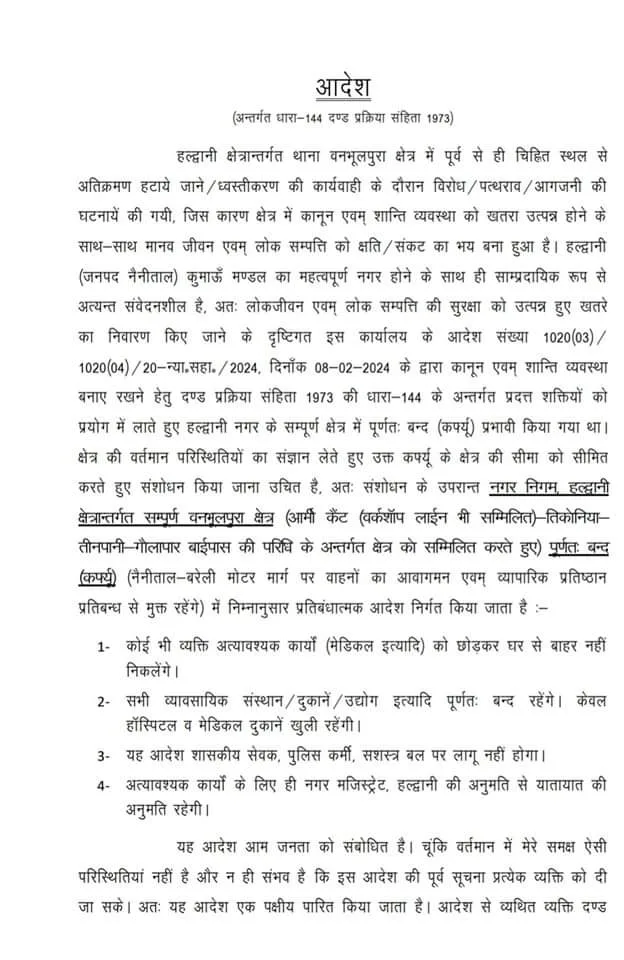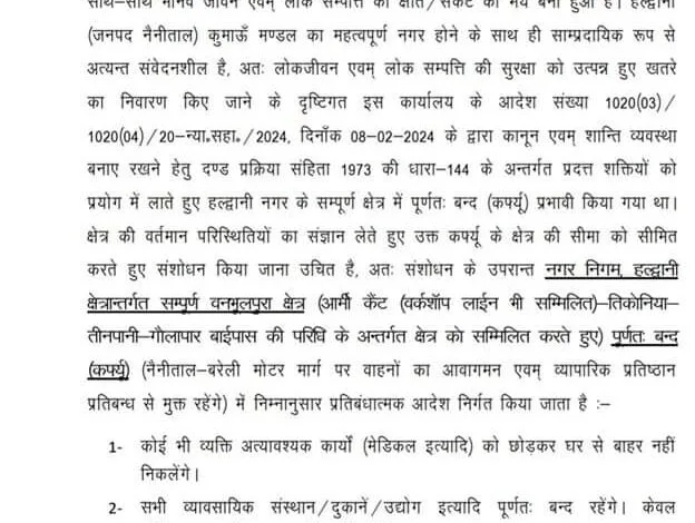 बड़ी खबर : बनभूलपुरा, हल्द्वानी में कर्फ्यू को लेकर नया आदेश जारी, देखें आदेश