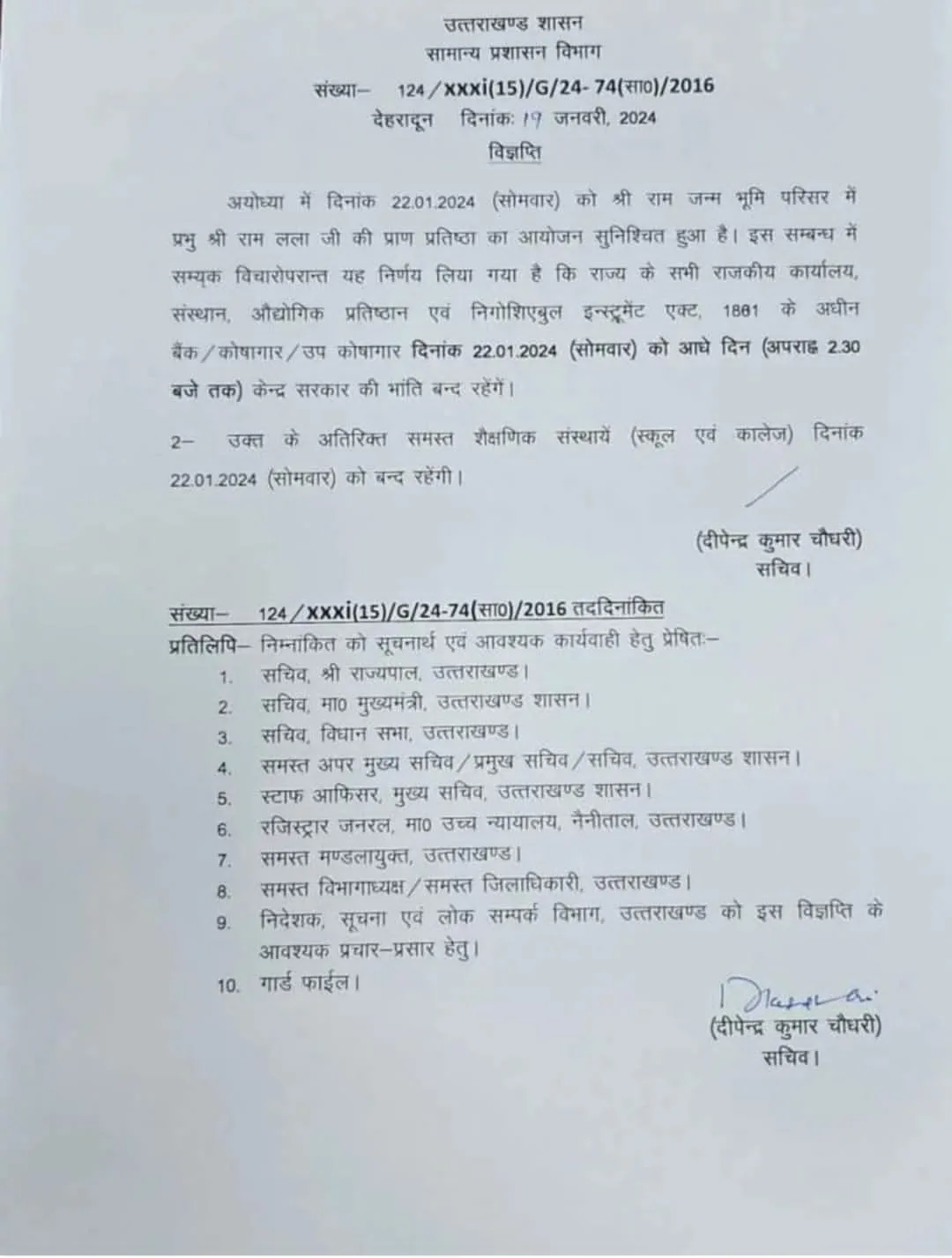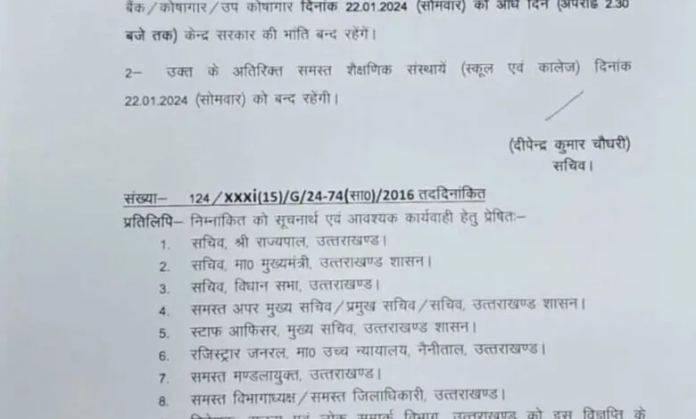 अयोध्या में दिनांक 22.01.2024 को श्री राम जन्म भूमि में श्री राम लला की प्राण प्रतिष्ठा के दृष्टिगत राज्य के सभी राजकीय कार्यालय, संस्थान, औद्योगिक प्रतिष्ठान एवं बैंक /कोषागार /उप कोषागार दिनांक 22 जनवरी को आधे दिन (अपराह्न 2.30 बजे तक) केन्द्र सरकार की भांति बन्द रहेंगे। इसके अतिरिक्त समस्त शैक्षणिक संस्थान (स्कूल एवं कॉलेज) दिनांक 22.01.2024 (सोमवार) को बन्द रहेंगे।