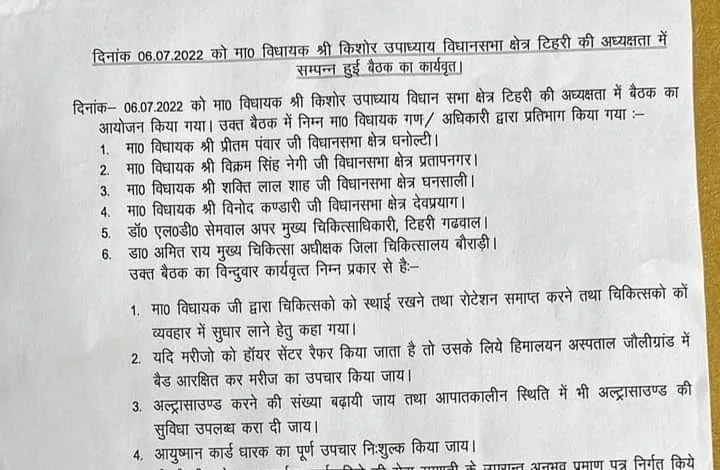 दिनांक 06 07 2022 को माननीय विधायक श्री किशोर उपाध्याय विधानसभा क्षेत्र टिहरी की अध्यक्षता में संपन्न हुई बैठक का कार्यवृत।