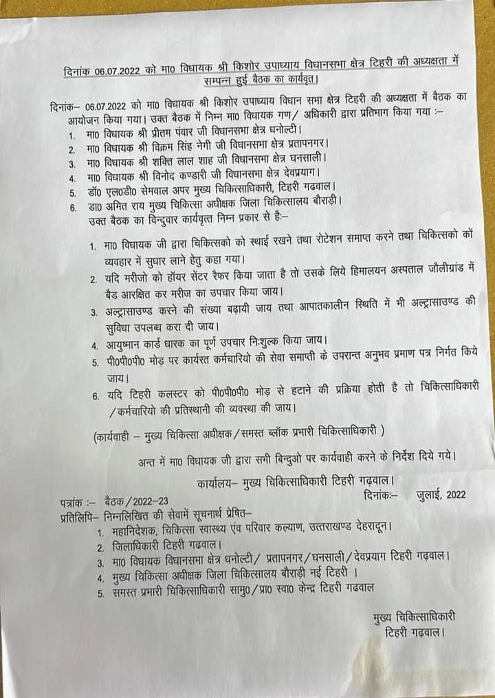 दिनांक 06 07 2022 को माननीय विधायक श्री किशोर उपाध्याय विधानसभा क्षेत्र टिहरी की अध्यक्षता में संपन्न हुई बैठक का कार्यवृत।