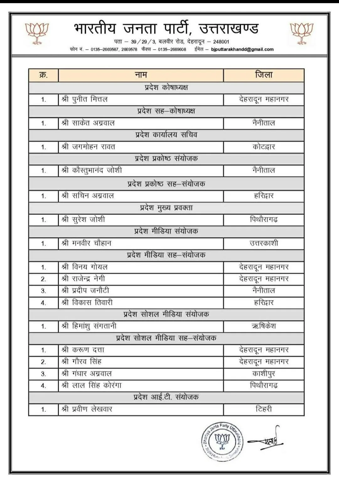 भाजपा ने जारी की प्रदेश कार्यकारिणी, टीम में अनुभव और ऊर्जा का संगम