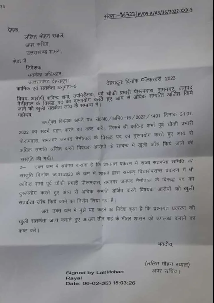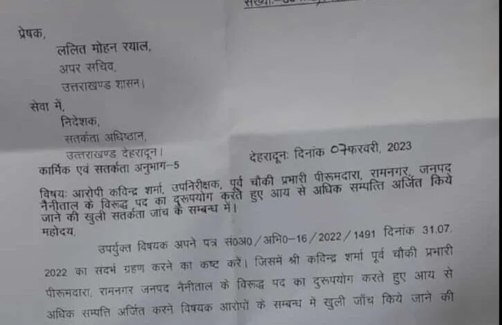 उधमसिंहनगर में चौकी इंचार्ज के पद पर तैनात नैनीताल की चौकी पिरूमदारा, रामनगर के पूर्व इंचार्ज दरोगा कविंद्र शर्मा के खिलाफ आय से अधिक संपत्ति अर्जित करने के मामले में विजिलेंस जांच के आदेश हुए हैं।
