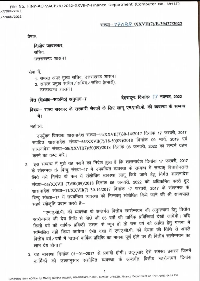 “एम.ए.सी.पी. की व्यवस्था के अन्तर्गत वित्तीय स्तरोन्नयन की अनुमन्यता हेतु वित्तीय स्तरोन्नयन की देय तिथि से पीछे की 05 वर्षों की वार्षिक प्रविष्टियां देखी जायेंगी। यदि किसी वर्ष की वार्षिक प्रविष्टी ‘उत्तम’ से न्यून हो तो उस वर्ष को अर्हता हेतु गणना में सम्मिलित नहीं किया जायेगा। ऐसी दशा में एम.ए.सी.पी. की देयता की तिथि से अगले वित्तीय वर्ष / वर्षों में उत्तम वार्षिक प्रविष्टि का मानक पूर्ण होने पर ही वित्तीय स्तरोन्नयन का लाभ देय होगा।”