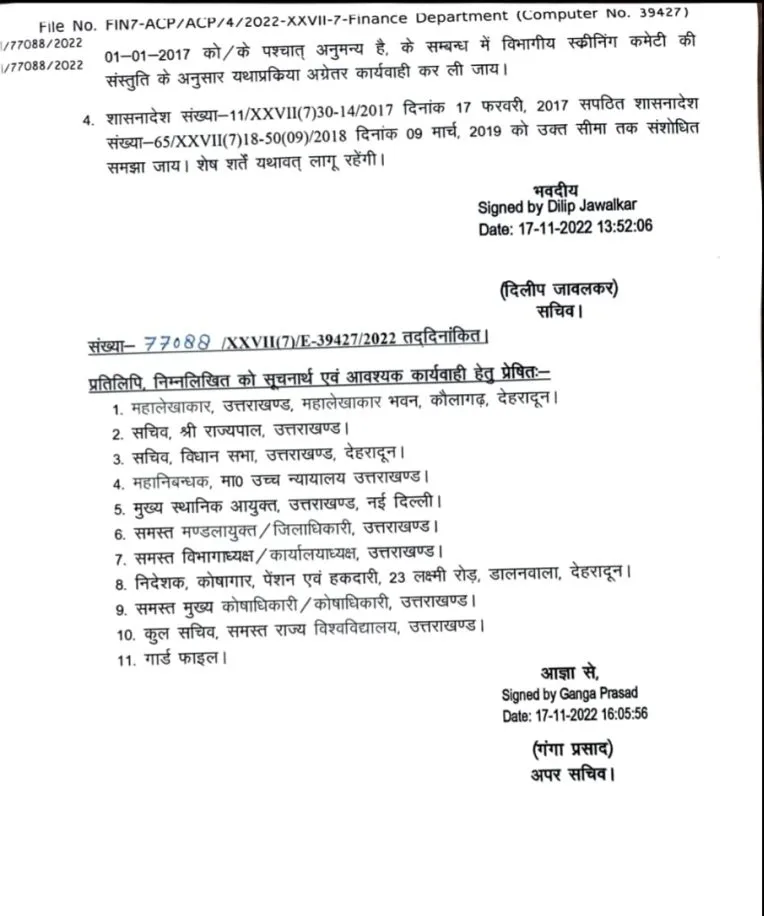 2. इस सम्बन्ध में मुझे यह कहने का निदेश हुआ है कि शासनादेश दिनांक 17 फरवरी 2017 के संलग्नक के बिन्दु संख्या-17 में उपबन्धित व्यवस्था के सम्बन्ध में सम्यक् विचारोपरान्त लिये गये निर्णय के क्रम में संशोधित व्यवस्था लागू किये जाने हेतु निर्गत शासनादेश संख्या – 05/XXVII (7) /50(09)/2018 दिनांक 06 जनवरी, 2022 को अधिकमित करते हुए शासनादेश संख्या-11/XXVII (7) 30-14/2017 दिनांक 17 फरवरी, 2017 के संलग्नक के बिन्दु संख्या-17 में उपबन्धित व्यवस्था को निम्नवत् संशोधित किये जाने की श्री राज्यपाल सहर्ष स्वीकृति प्रदान करते है:-