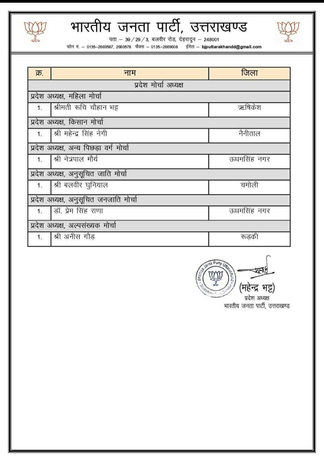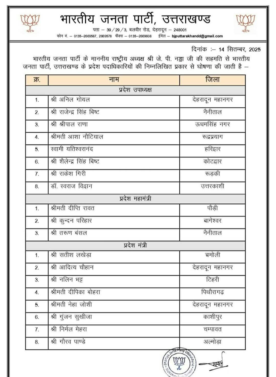 भाजपा ने जारी की प्रदेश कार्यकारिणी, टीम में अनुभव और ऊर्जा का संगम