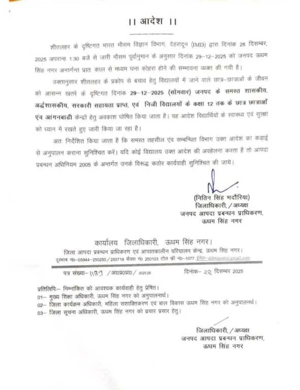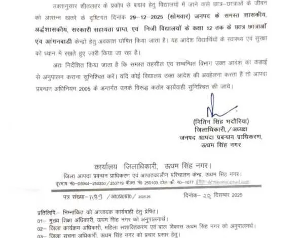 Home/उत्तराखंड/शीतलहर का कहर! 29 दिसंबर को कक्षा 12 तक सभी स्कूल-आंगनबाड़ी बंद | आदेश जारी उत्तराखंडशिक्षाशीतलहर का कहर! 29 दिसंबर को कक्षा 12 तक सभी स्कूल-आंगनबाड़ी बंद | आदेश जारीशीतलहर का कहर! 29 दिसंबर को कक्षा 12 तक सभी स्कूल-आंगनबाड़ी बंद | आदेश जारीDecember 28, 20250 876 Less than a minute Facebook Twitter WhatsApp Telegram See also बड़ी खबर: उत्तराखण्ड में डिप्लोमा इंजीनियर्स की हड़ताल स्थगित, कामकाज होगा बहाल Tags12 cold wave December 29 school-anganwadiDecember 28, 20250 876 Less than a minute Facebook Twitter WhatsApp Telegram Share Facebook Twitter WhatsApp Telegram Share via Email Print