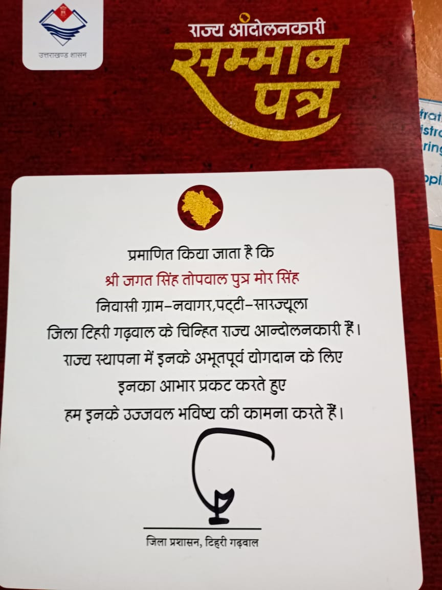 टिहरी। उत्तराखंड राज्य आंदोलन में अहम भूमिका निभाने वाले टिहरी जिले के चंबा ब्लॉक के ग्राम नवागर निवासी वरिष्ठ पत्रकार जगत सिंह तोपवाल को उत्तराखंड राज्य स्थापना दिवस के रजत जयंती समारोह के अवसर पर सम्मानित किया गया।