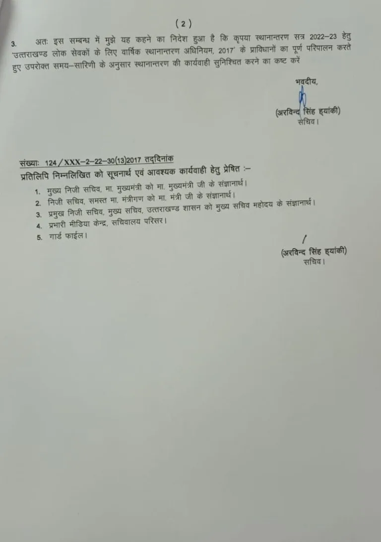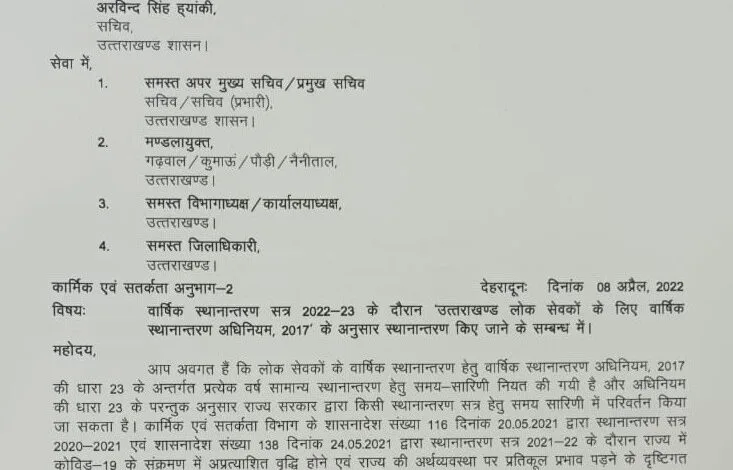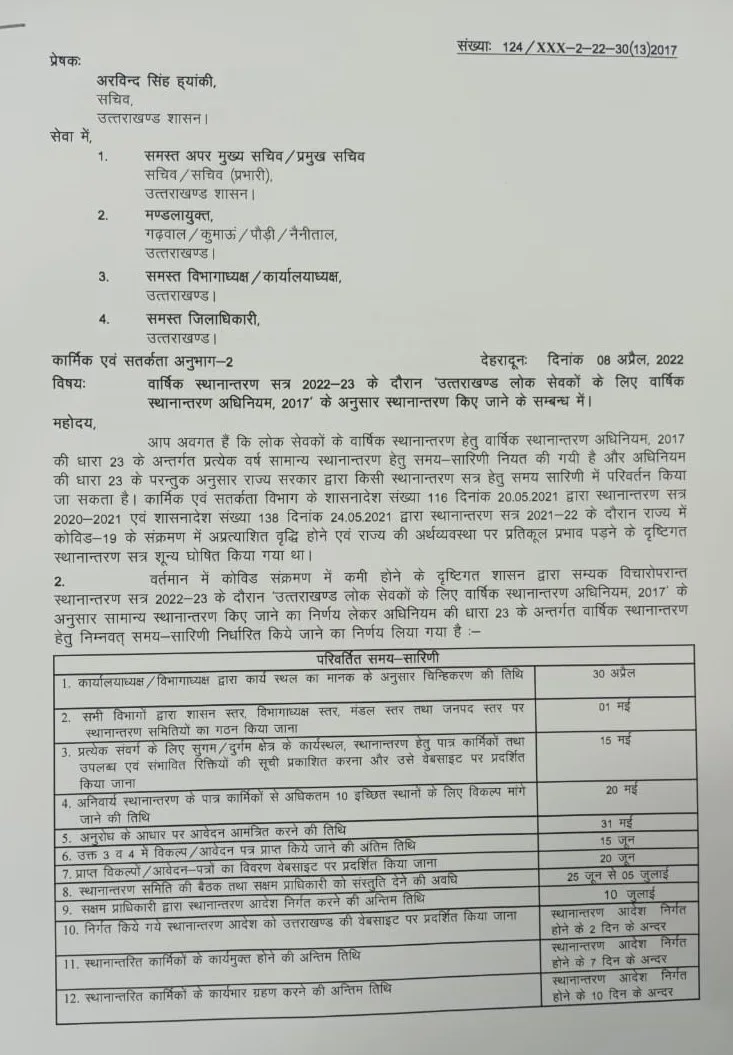 धामी सरकार का एक और बड़ा फैसला सामने आया है वार्षिक स्थानान्तरण सत्र 2022-23 के दौरान उत्तराखण्ड लोक सेवकों के लिए वार्षिक स्थानान्तरण अधिनियम, 2017 के अनुसार स्थानान्तरण किए जाने के सम्बन्ध में। बड़ा आदेश जारी किया गया हैं और लोक सेवकों के ट्रांसफर को लेकर समय सारणी सरकार ने जारी कर दी है