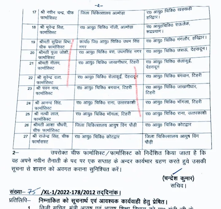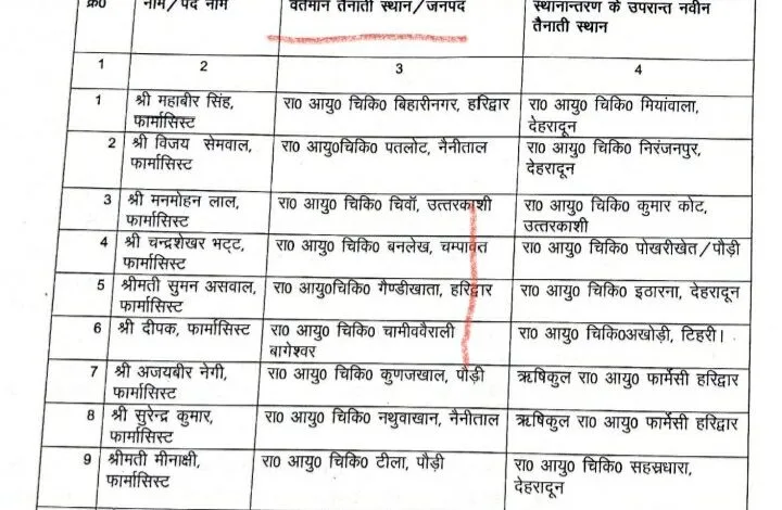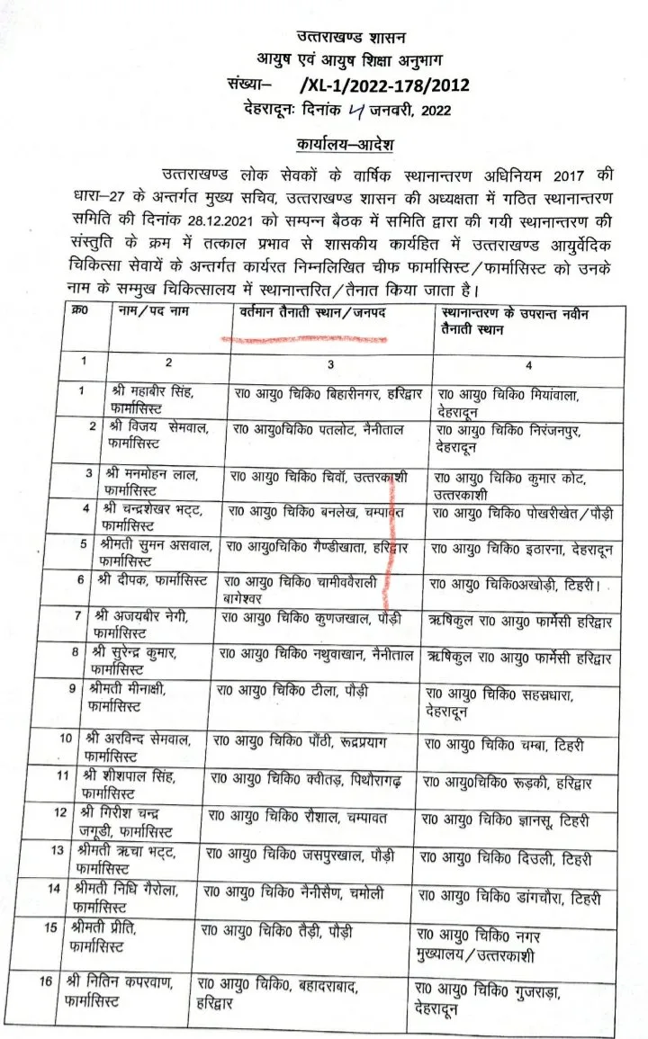 स्वास्थ्य विभाग में लगातार स्थानांतरण जारी हैं ऐसे में विभाग ने उत्तराखण्ड लोक सेवकों के वार्षिक स्थानान्तरण अधिनियम 2017 की धारा 27 के अन्तर्गत मुख्य सचिव, उत्तराखण्ड शासन की अध्यक्षता में गठित स्थानान्तरण समिति की दिनांक 28.12.2021 को सम्पन्न बैठक में समिति द्वारा की गयी स्थानान्तरण की संस्तुति के क्रम में तत्काल प्रभाव से शासकीय कार्यहित में उत्तराखण्ड आयुर्वेदिक चिकित्सा सेवायें के अन्तर्गत कार्यरत निम्नलिखित चीफ फार्मासिस्ट / फार्मासिस्ट को उनके नाम के सम्मुख चिकित्सालय में स्थानान्तरित / तैनात किया जाता