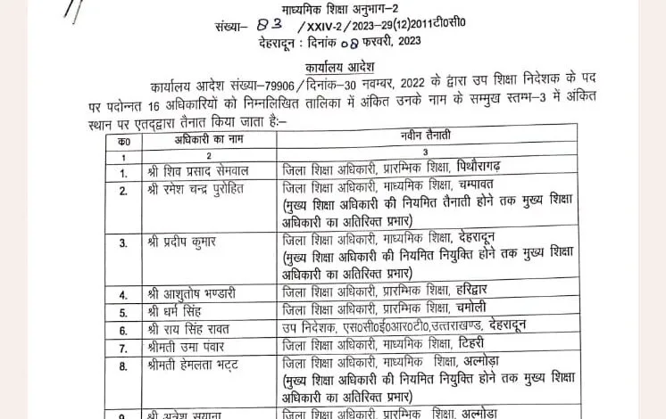 कार्यालय आदेश संख्या-79906 / दिनांक 30 नवम्बर, 2022 के द्वारा उप शिक्षा निदेशक के पद पर पदोन्नत 16 अधिकारियों को निम्नलिखित तालिका में अंकित उनके नाम के सम्मुख स्तम्भ-3 में अंकित स्थान पर एतद्द्वारा तैनात किया जाता है:-