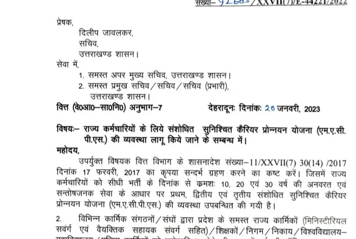 उपर्युक्त विषयक वित्त विभाग के शासनादेश संख्या – 11/XXVII ( 7 ) 30 (14) / 2017 दिनांक 17 फरवरी, 2017 का कृपया सन्दर्भ ग्रहण करने का कष्ट करें जिसमें राज्य कर्मचारियों को सीधी भर्ती के दिनांक से क्रमशः 10, 20 एवं 30 वर्ष की अनवरत एवं सन्तोषजनक सेवा के आधार पर प्रथम, द्वितीय एवं तृतीय संशोधित सुनिश्चित कैरियर प्रोन्नयन योजना (एम.ए.सी.पी.एस.) की व्यवस्था उपबन्धित की गयी है।