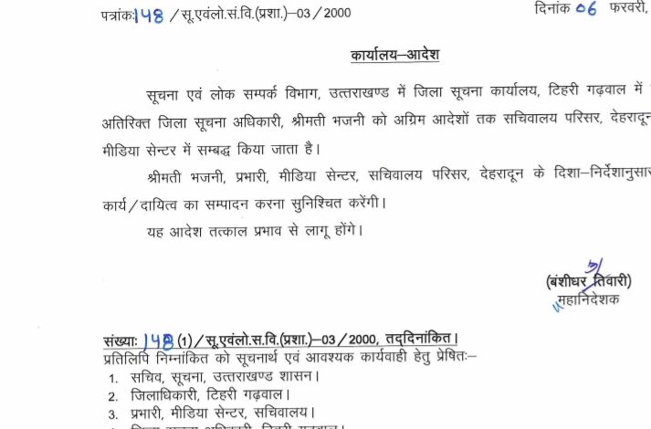 टिहरी की अतिरिक्त जिला सूचना अधिकारी भजनी देहरादून मीडिया सेंटर से संबद्ध, आदेश जारी