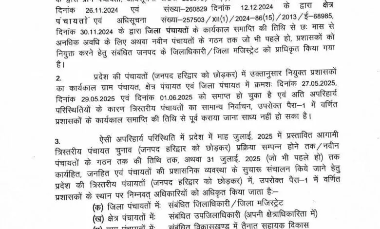 प्रदेश में पंचायती राज चुनाव की अधिसूचना अभी तक जारी नहीं हुई है। ऐसे में निर्वाचित जनप्रतिनिधियों के कार्यकाल समाप्त होने के बाद शासन ने अंतरिम व्यवस्था के तहत प्रशासकों के कार्यकाल को 31 जुलाई तक बढ़ाने का निर्णय लिया है। इससे पंचायत स्तर पर चल रहे विकास कार्य और जनसेवा से जुड़े कार्यक्रम प्रभावित नहीं होंगे।