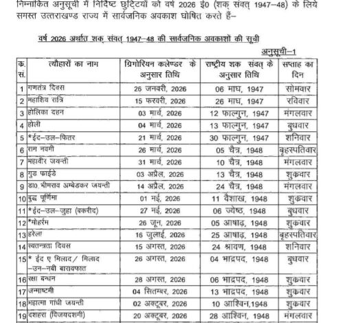 आज की बड़ी खबर : शासन ने जारी किया 2026 का अवकाश कैलेंडर, जानिए साल भर कब-कब रहेंगी छुट्टियां