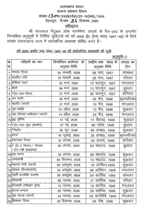 शासन ने जारी किया 2026 का अवकाश कैलेंडर, जानिए साल भर कब-कब रहेंगी छुट्टियां