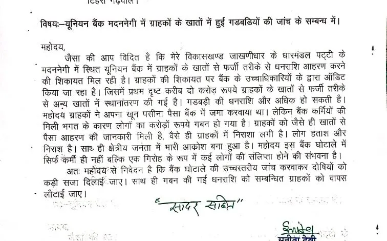डीएम और एसएसपी को दिए ज्ञापन में बताया कि स्थानीय लोगों ने कड़ी मेहनत कर अपने खून पनीसा बहाकर सुरक्षित भविष्य के लिए यूनियन बैंक मदननेगी में पैसा जमा करवाया था। लेकिन बैंक कर्मियों की मिली भगत से ग्राहकों का करोड़ों रुपये का गबन हुआ है। बताया कि दो दिन से चल रही जांच में अभी तक करीब तीन करोड़ का गोलमाल हुआ है। ग्राहकों ने जो एफडी करवाई है, उसके सापेक्ष पैसा नहीं है। जैसे ही लोगों को गबन की शिकायत मिली है, वैसे ही लोग दूर-दराज से बैंक पहुंचकर अपने खातों का बैलेंस चक रहे हैं। जिसमें उन्हें पैसा ही नहीं मिल पा रहा है। ऐसे में ग्राहकों से लेकर स्थानीय लोगों में रोष बना हुआ है। उन्होंने डीएम और एसएसपी से बैंक घोटाले की जांच के लिए एसआईटी का गठन करते हुए दोषियों को सख्त सजा और ग्राहकों के पैसे वापस लौटाने की मांग की।